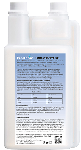 perethrin-konzentrat-ppp-dosierflasche-rueckseite gut sichtbares Etikett auf der Rueckseite der Dosierflasche